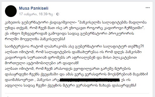 პანკისის სათემო რადიო WAY მუსა პანკისელსაც დაუკავშირდა იმის დასაზუსტებლად, რაზე დაყრდნობით გააკეთა განცხადება გუბერნატორის მხრიდან სალაფიტების მიმართ მუქარის თაობაზე. მუსა პანკისელისგან განმარტება ვერ მივიღეთ. მან სატელეფონო საუბრის შეწყვეტამდე თავის ფეისბუქ სტატუსზე მიგვითითა, სადაც წერს: გუბერნატორმა „რუსთავი 2“-თან სატელევიზიო კომენტარში თავისი სიტყვები კი არ უარყო, არამედ აქცენტი გააკეთა იმაზე, რომ სალაფიტები შეხვედრას არ ვესწრებოდით. დიახ, არ ვესწრებოდით შეხვედრას, რადგან დღევანდელი ხელისუფლება პანკისის მოსახლეობის დაყოფას ახდენს მისაღებ და მიუღებელ კატეგორიებად. ხეობის უმრავლეს ნაწილს ხელისუფალნი არ გვხდებიან არ გვესაუბრებიან, არ გვაღიარებენ. გუბერნატორს რომ მივეწვიეთ დახურულ შეხვედრაზე, აუცილებლად დავესწრებოდით. თუმცა, ირკვევა რომ გუბერნატორიც და პანკისის ხეობაში საქმიანობით დაინტერესებული სხვა პირნიც მოპასუხის გარეშე თავს კომფორტულად გრძნობდნენ და განტევების ვაცად ჩვენ გვაქციეს“.