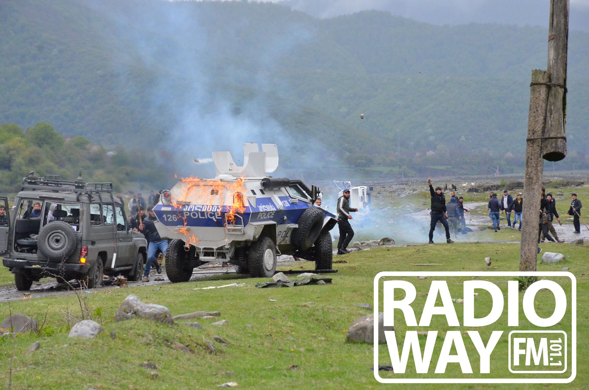 აქციის მონაწილეებმა დაწვეს და დაამტვრიეს შს სამინისტროს მანქანები და ტექნიკა, ასევე ჰესების მშენებელი კომპანიის კუთვნილი ტრაქტორი.